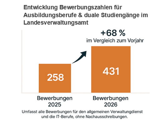 Für den Ausbildungs- und Studienjahrgang 2026 verzeichnet das LVwA im Vergleich zum Vorjahr einen Zuwachs von rund 68 Prozent bereits in der ersten Bewerbungsrunde. Besonders gefragt sind die Ausbildungsrichtungen Verwaltungsfachangestellte/-r sowie Fachinformatiker/-in für Systemintegration.
