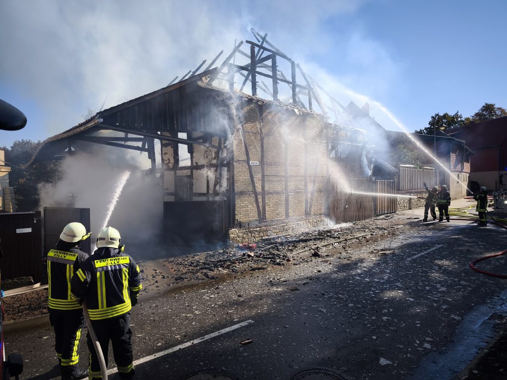 Nach derzeitigem Erkenntnisstand handelte es sich bei der Scheune um ein Objekt auf zwei angrenzenden Grundstücken in der Hauptstraße mit zwei Eigentümern. Aus bisher ungeklärter Ursache geriet das Gebäude gegen 11:00 Uhr in Brand.