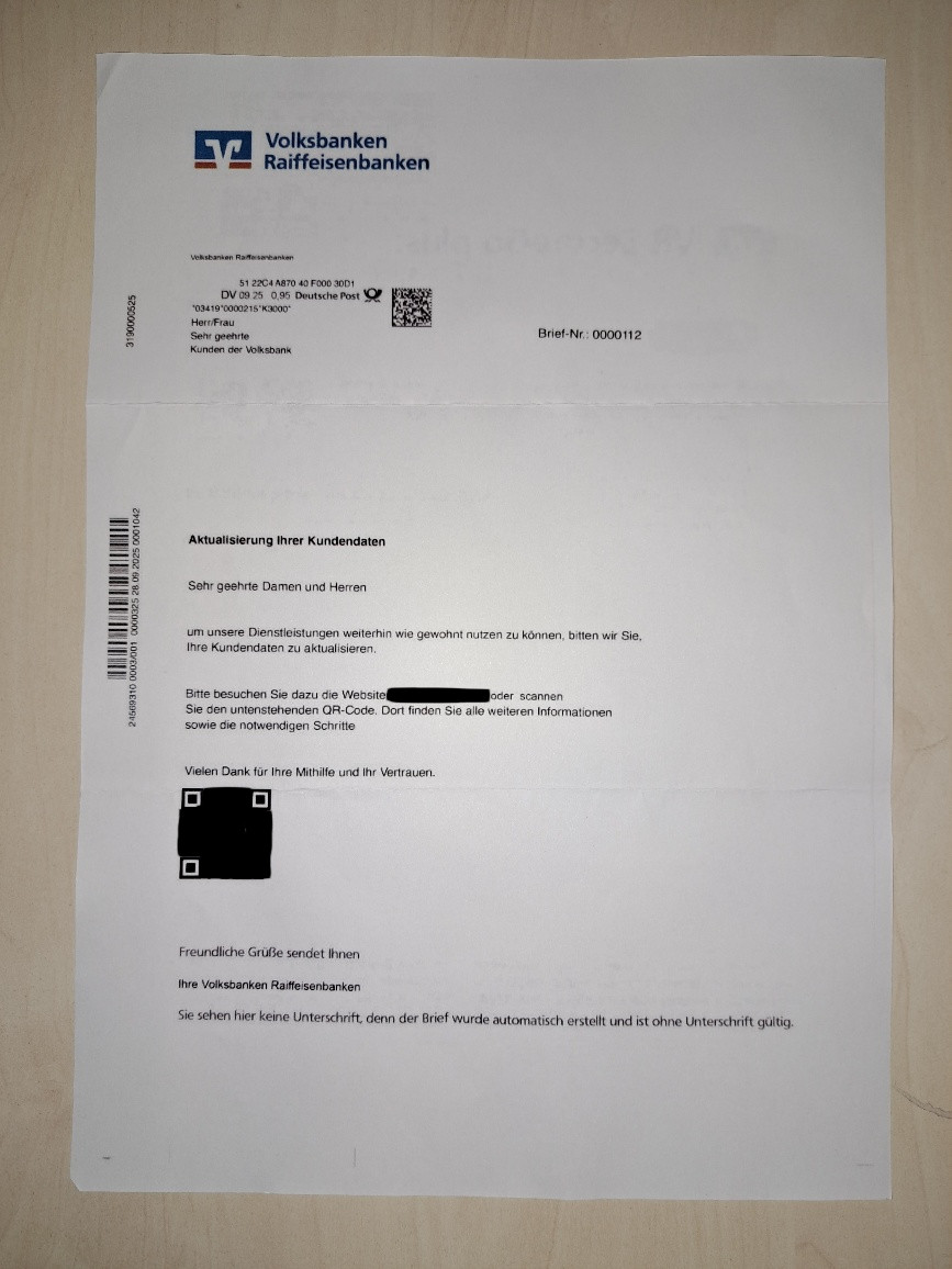Echte Aktualisierungen von Kundendaten erfolgen ausschließlich über persönliche Anschreiben Ihrer Bank. Banken versenden keine anonymisierten oder allgemein gehaltenen Schreiben mit der Aufforderung, Daten über Links oder QR‑Codes zu bestätigen.