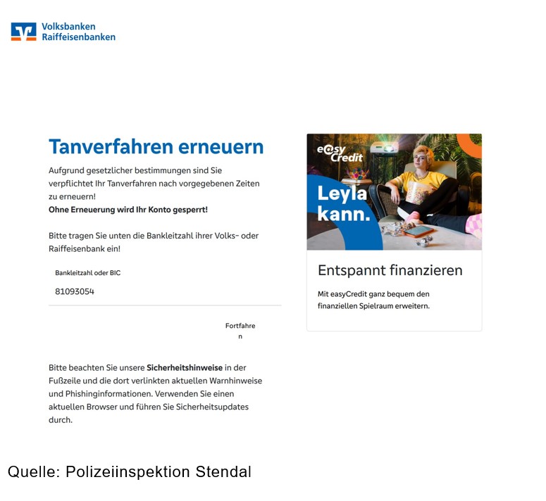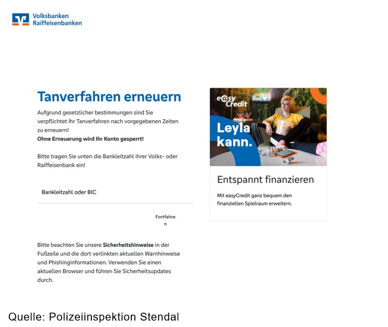In der vergangenen Woche hat die Polizeiinspektion Stendal bereits aus aktuellem Anlass vor einer neuen Phishing‑Betrugsmasche im Bereich Stendal gewarnt. Im Raum Stendal wurden gefälschte Schreiben im Namen der „Volksbanken Raiffeisenbanken“ versendet, die einen nicht funktionsfähigen Link zu einer betrügerischen Internetseite enthielten. In diesen Schreiben wurden die Empfänger aufgefordert, ihre Kundendaten über einen Link oder den beigefügten QR‑Code zu aktualisieren.