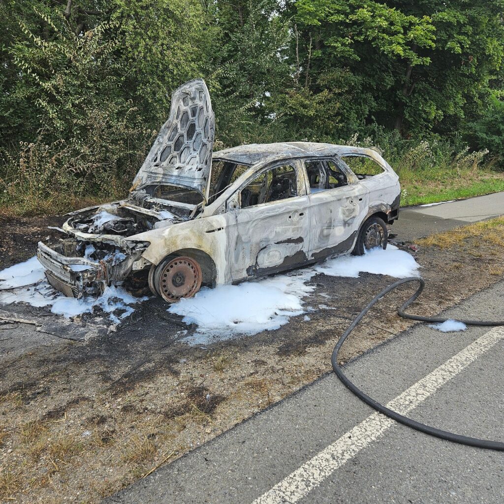 Der Fahrer nahm zunächst eine Rauchentwicklung aus dem Motorraum wahr. Bevor sich das Feuer auf das gesamte Fahrzeug ausbreitete, gelang es dem Fahrer, das Auto von der Autobahn zu steuern und an der Landesstraße 66 abzustellen. Hier brannte der PKW vollständig aus. Der Fahrer blieb unverletzt. Alarmierte Feuerwehrkräfte löschten das Fahrzeug. Es entstand ein Sachschaden von etwa 8.000 Euro.