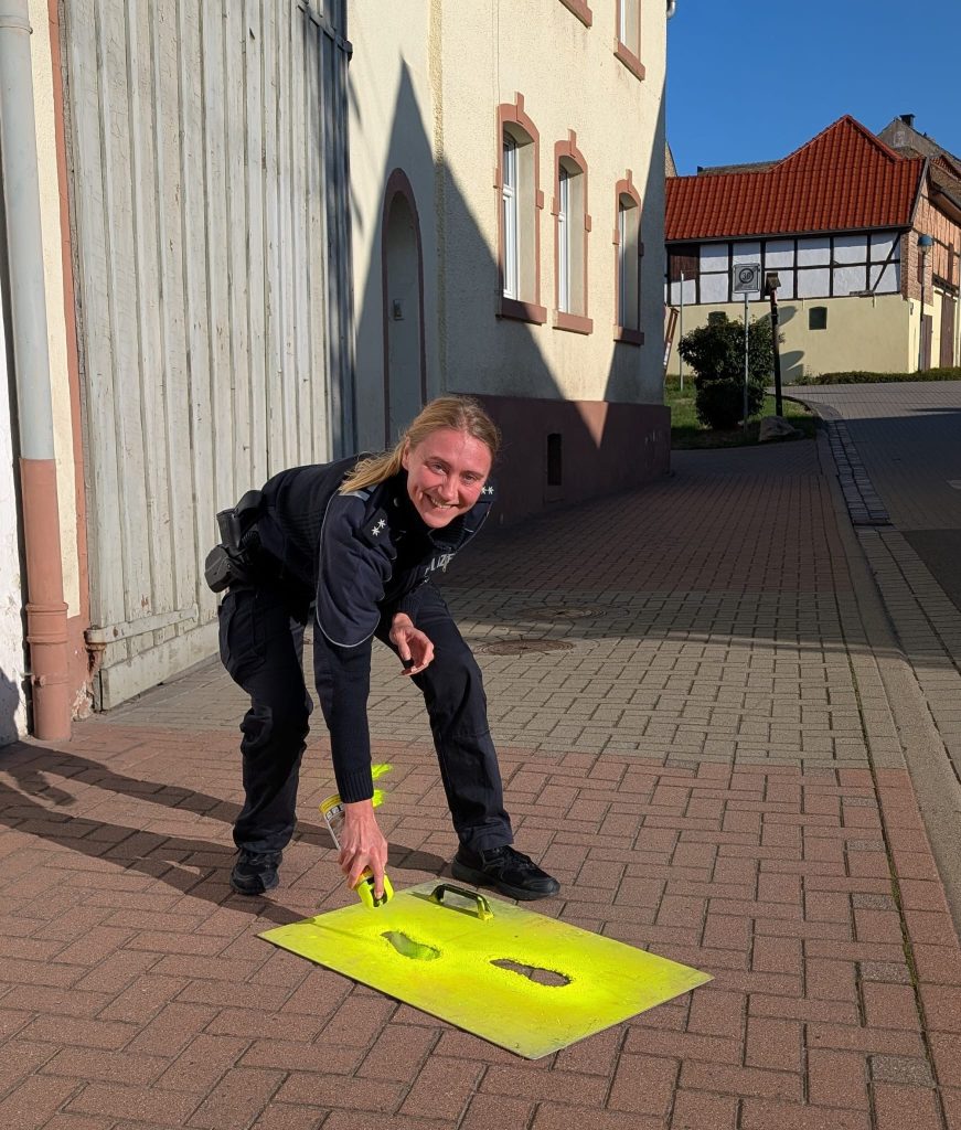 Darüber hinaus brachten Polizeibeamte an ausgewählten Übergängen gelbe Fußabdrücke auf Gehwegen auf – wie auf dem folgenden Foto der Regionalbereichsbeamten aus Thale zu sehen, im Thalenser Ortsteil Westerhausen. Diese Markierungen dienen Schulkindern als Orientierung und helfen dabei, sichere Querungsstellen im Straßenverkehr zu erkennen.