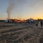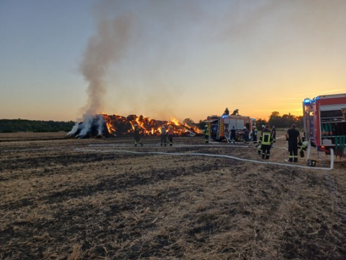 Die Polizei und Feuerwehr kamen am Montagabend bei einem Brand auf einem abgeernteten Kornfeld zum Einsatz. Gebrannt hatte eine dortige Strohballenmiete. Etwa 100 Strohballen fielen den Flammen zum Opfer. Die zuständigen Feuerwehren kamen mit 49Kameraden und 9 Fahrzeuge zum Einsatz. Mit Hilfe des Bauers, der das Stroh umpflügte, konnte der Brand gemeinsam in Schach gehalten und schließlich gelöscht werden. Die Brandursache ist ungeklärt.