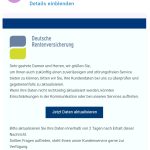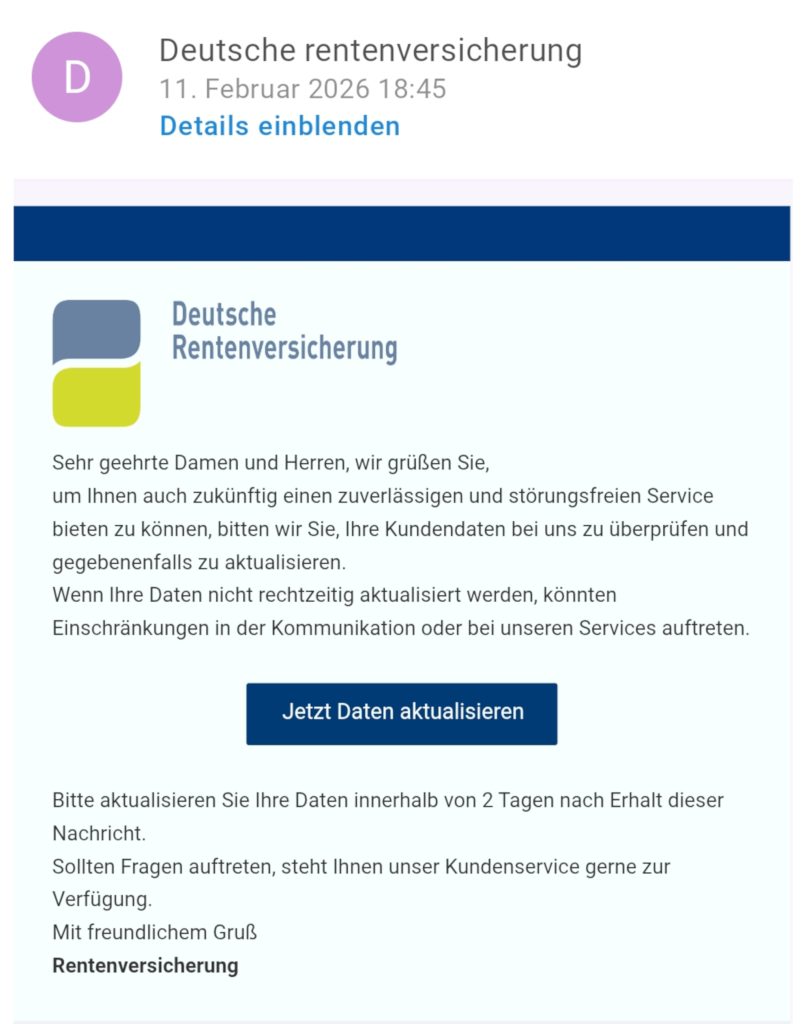 Durch eine 63-jährige Anzeigenerstatterin wurde der Polizei mitgeteilt, dass sie offenbar eine E-Mail von der Deutschen Rentenversicherung erhalten habe. In dieser E-Mail wurde sie aufgefordert, ihre Daten zu überprüfen. Die Frau reagierte richtig: Sie klickte nicht auf den Link in der E-Mail, sondern rief bei der ihr bekannten Rufnummer der Deutschen Rentenversicherung an. Dort wurde ihr mitgeteilt, dass es sich um eine gefälschte E-Mail handelt.