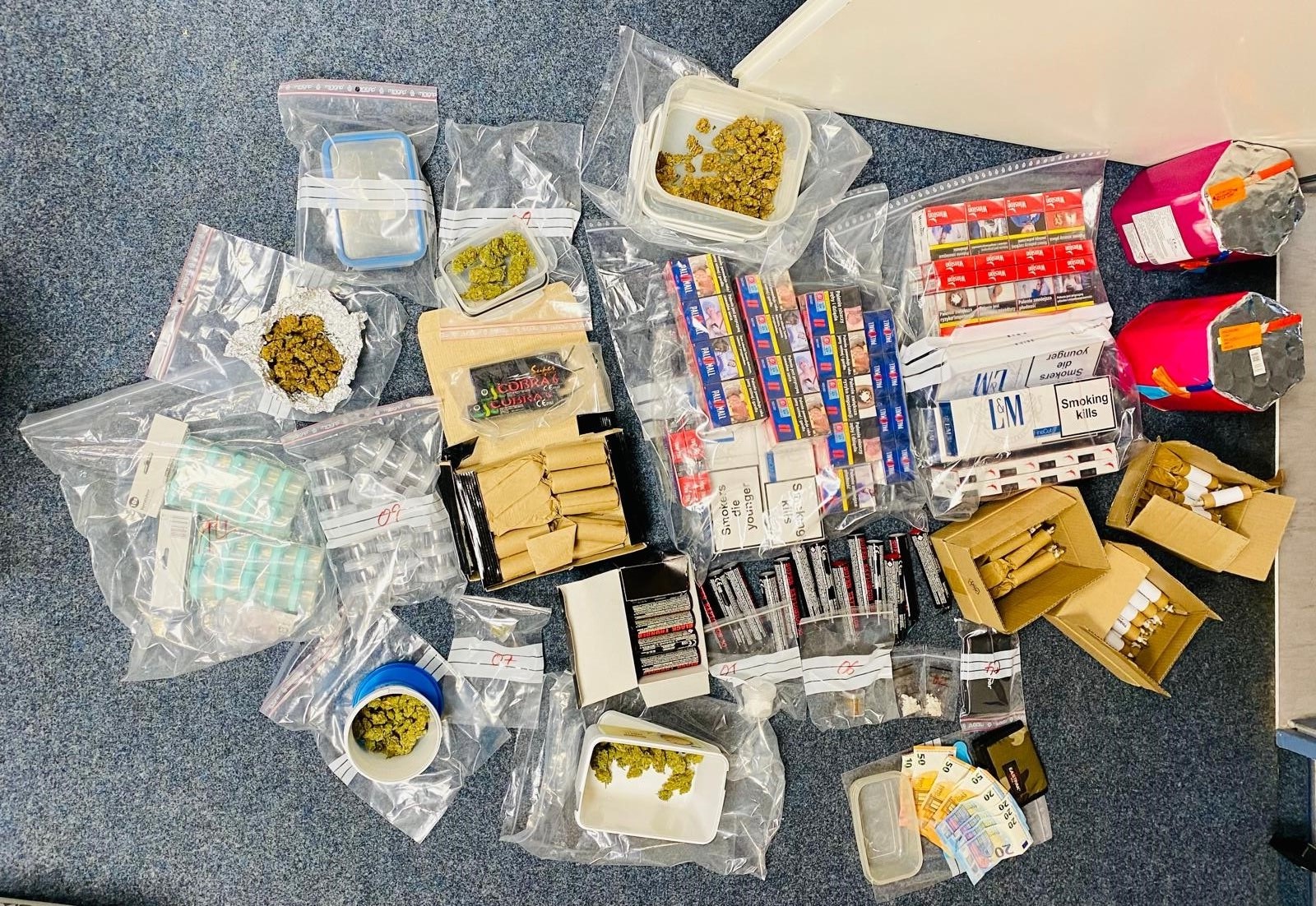 Während der Durchsuchung konnten die Einsatzkräfte mehrere Gramm verschiedener Betäubungsmittel, darunter Cannabis und Kokain, sowie typisches Verpackungsmaterial und Bargeld in mittlerer vierstelliger Höhe sicherstellen, die nach ersten Erkenntnissen dem Drogenhandel zugeordnet werden können. Zudem wurden diverse nicht zugelassene Feuerwerkskörper und mehrere Packungen unverzollter Zigaretten beschlagnahmt.
