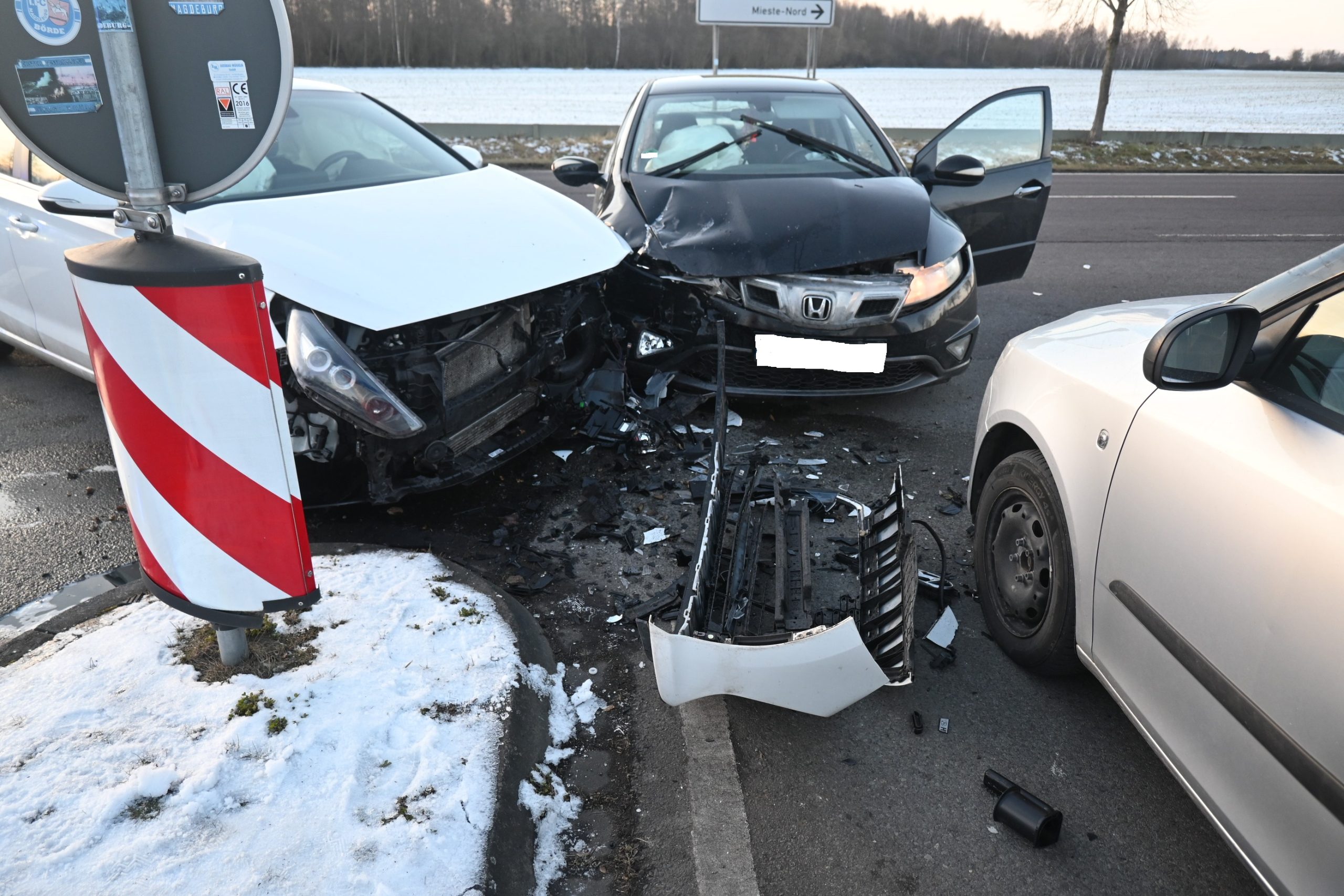 Eine 39-jährige Frau befuhr im Honda die B188 von Mieste in Richtung Miesterhorst. Die Fahrerin beabsichtigte von der Bundesstraße nach links auf die Thälmannstraße nach Mieste abzubiegen. Hierbei übersah sie einen im Gegenverkehr befindlichen Hyundai-Fahrer (48), der die Bundesstraße aus Richtung Miesterhorst befuhr. Nach eigenen Angaben hatte die Frau das Fahrzeug aufgrund der blendenden Sonne nicht gesehen. Beide Fahrzeuge stießen zusammen und blieben kurz vor einem Skoda-Fahrer stehen, der von der Thälmannstraße auf die B188 auffahren wollte. Der Hyundai-Fahrer und die Frau im Honda wurden durch den Unfall leichtverletzt und mit Rettungswagen ins Krankenhaus verbracht. Es entstand ein fünfstelliger Sachschaden und beide Fahrzeuge musste durch ein Abschleppunternehmen geborgen werden.