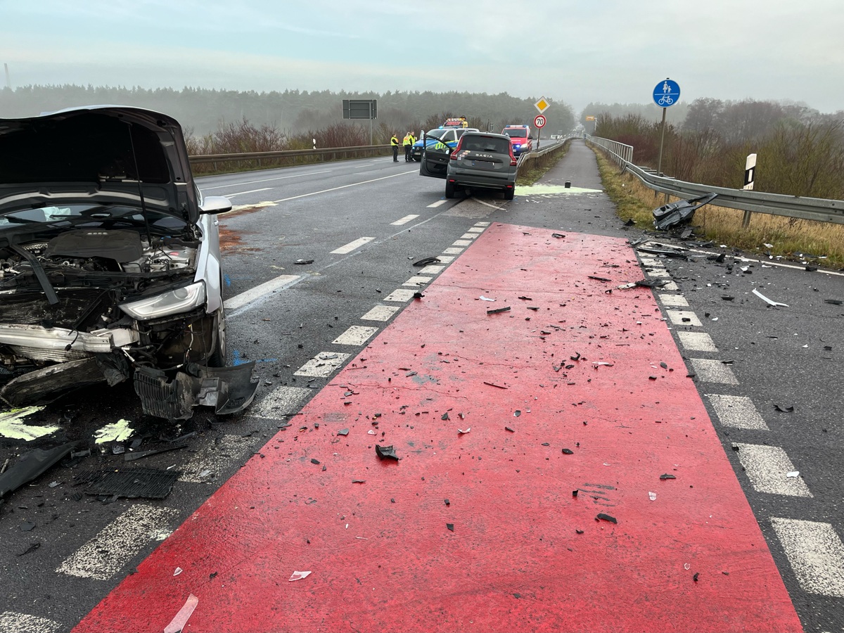 Ein 64-jähriger Fahrzeugführer eines PKW Dacia befuhr die B189 aus Richtung Stendal kommend und beabsichtigte, auf der Brücke kurz vor Dahlen, nach links auf die B188 (Ortsumfahrung Stendal) abzufahren. Dabei übersah er einen PKW Audi eines 68-jährigen Fahrzeugführers, welcher die B189 aus Richtung Dahlen in Richtung Stendal befuhr. Es kam zu einem heftigen Zusammenstoß während des Abbiegevorganges. Beide Fahrzeugführer wurden nach erster Einschätzung mit leichten Verletzungen in ein Krankenhaus eingeliefert. Die 49-jährige Beifahrerin im Dacia wurde im Fahrzeug eingeklemmt und musste durch die Freiwillige Feuerwehr mit technischem Gerät befreit werden. Sie wurde mit schweren Verletzungen in ein Krankenhaus eingeliefert. Es entstand ein Sachschaden im unteren fünfstelligen Bereich. Die Fahrbahn musste im Anschluss durch einen Fachbetrieb gereinigt werden. Es bestand eine Vollsperrung für einen Zeitraum von ca. zweieinhalb Stunden.