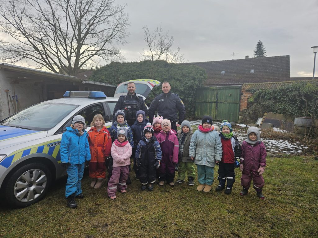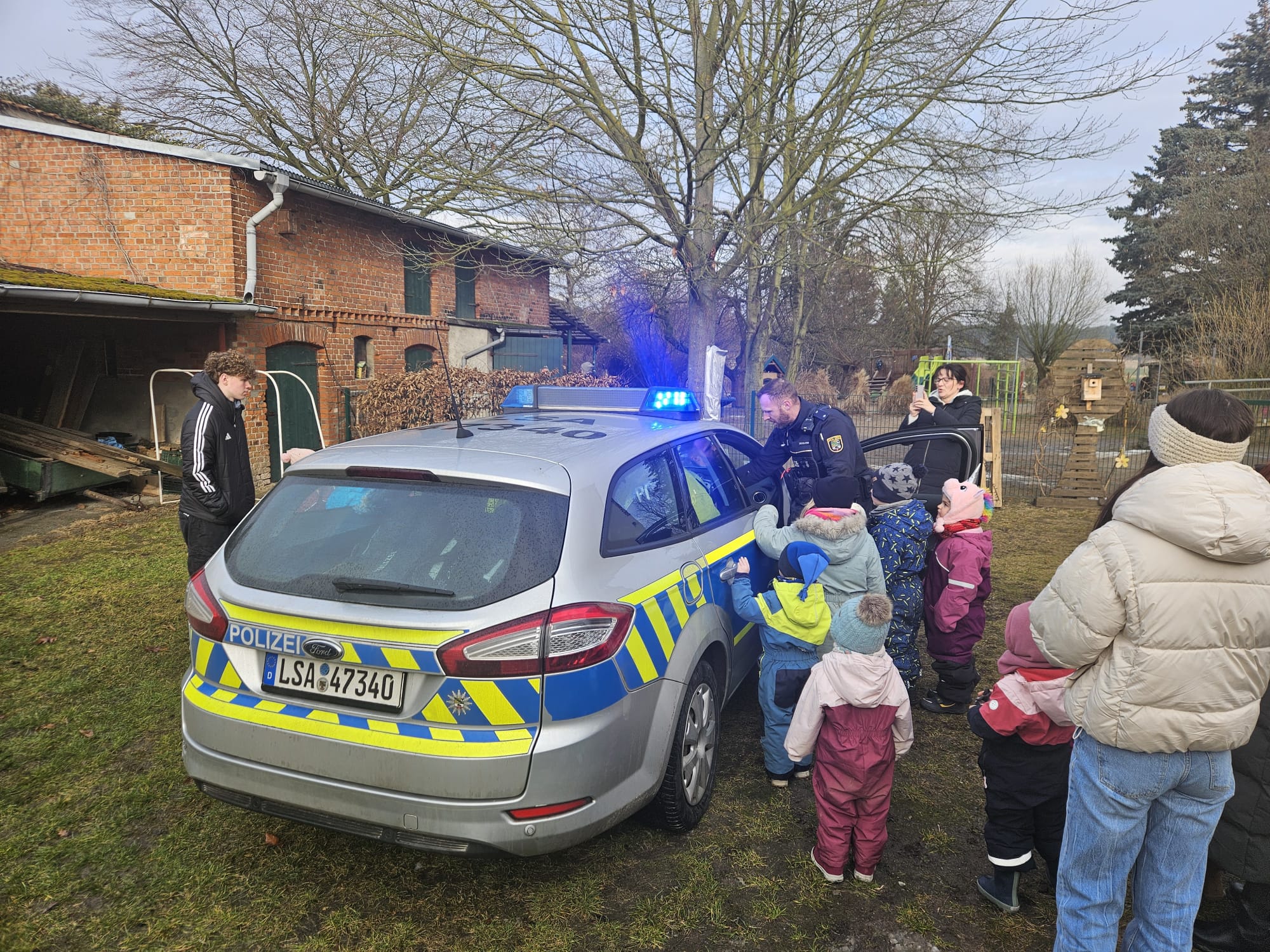 Die Regionalbereichsbeamten aus Bismark waren am Mittwochvormittag in der Kita in der Ortslage Berkau. Dabei wurde 12 Kindern die Polizei, ganz nach dem Motto „Polizei zum Anfassen“, vorgestellt und nähergebracht. Auch den Funkstreifenwagen konnten die Kinder ganz genau inspizieren. Die Begeisterung bei den Kindern war groß.