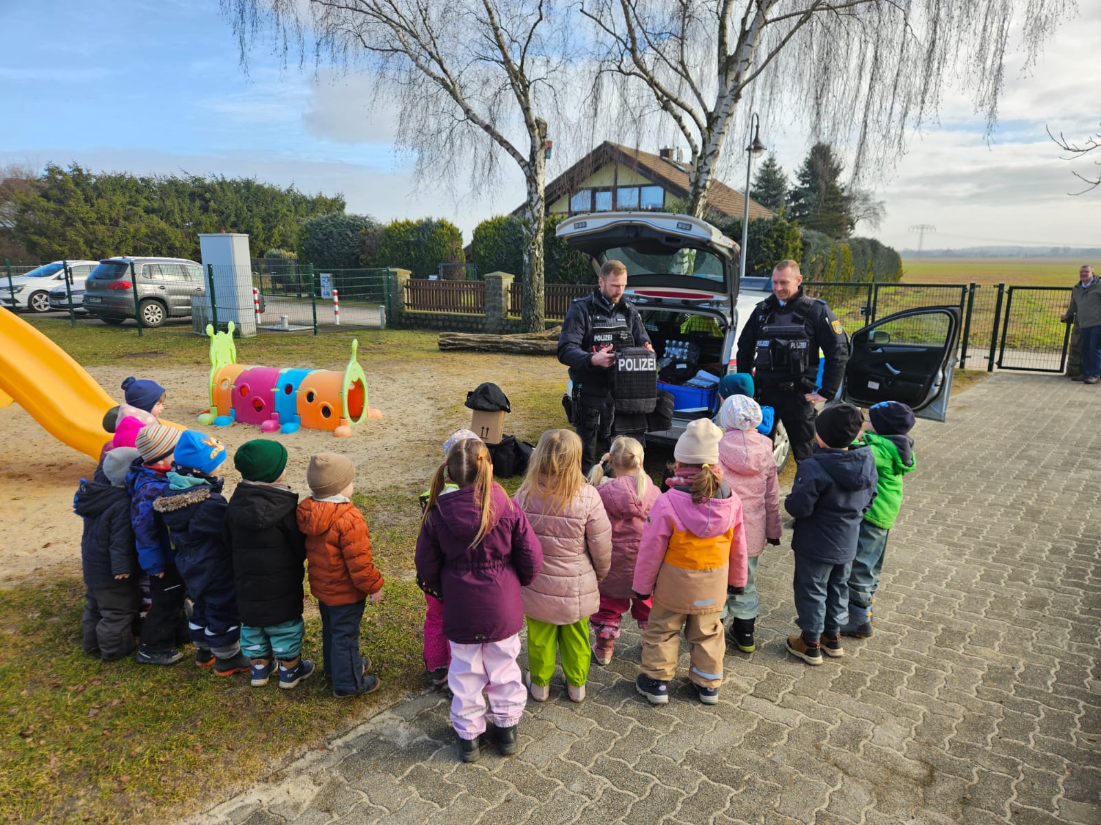 Die Bismarker Regionalbereichsbeamten haben in der Kita in Schinne eine Prävention durchgeführt. Dort konnten die insgesamt 18 Kinder die Arbeit der Polizei genauer kennenlernen und die Ausrüstung und den Funkstreifenwagen ganz genau inspizieren.