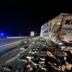 Nach ersten Erkenntnissen ist ein 59-Jähriger mit seinem Lastwagen aus bislang ungeklärter Ursache mit einem anderen LKW kollidiert, der zuvor in der Nothaltebucht gehalten hatte. Dabei wurde der Laderaum des stehenden LKW aufgerissen und mehrere Tonnen Fleischabschnitte verteilten sich auf dem rechten und mittleren Fahrstreifen.