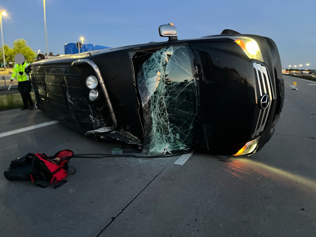 Ein 31- jähriger Fahrzeugführer beabsichtige mit seinem Mercedes Sprinter auf Höhe km 101,0 den Fahrstreifen zu wechseln. Hierbei übersah dieser den sich bereits auf der mittleren Spur befindlichen VW Passat. Trotz eingeleiteter Bremsung konnte der Fahrzeugführer des VW den Zusammenstoß nicht mehr verhindern. Der 31-jährige Fahrer des Mercedes Sprinter verlor die Kontrolle über sein Fahrzeug, kollidierte mit der Mittelleitplanke und überschlug sich. Anschließend kam der Pkw auf der Fahrerseite liegend zum Stillstand.