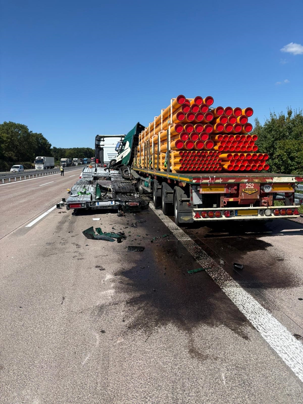Ersten Erkenntnissen zufolge hatte sich der Verkehr aufgrund eines vorherigen Unfalls in Niedersachsen gestaut. Ein 63-jähriger Fahrer eines mit Kunststoffrohren beladenen Lkw bemerkte das Stauende zu spät und fuhr auf einen vor ihm stehenden, leeren Autotransporter auf. Durch die Wucht des Aufpralls schob sich der Lkw bis auf die Ladefläche des Autotransporters und kam dort zum Stehen. In weiterer Folge prallten beide Fahrzeuge auf einen weiteren Lkw.