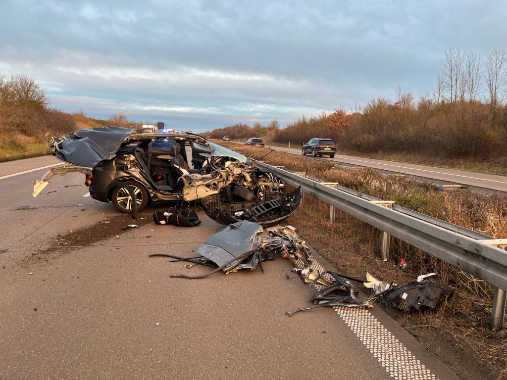 Durch die Kollision schleuderte der Pkw an die Mittelschutzplanke, touchierte einen weiteren Lkw und kam schließlich wieder an der Mittelschutzplanke zum Stehen.